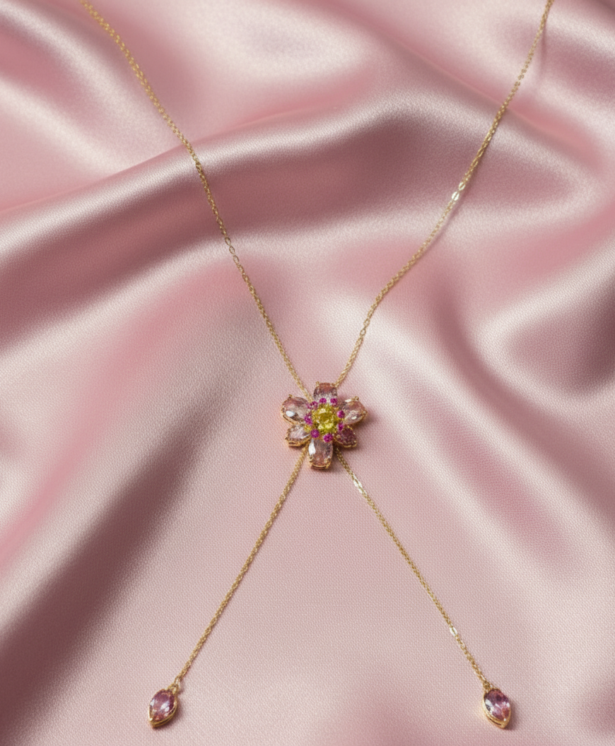 Günün her anında ışığınızı yansıtacak, doğanın zarafetinden ilham alan pembe kristal çiçekli çelik kolye ile tanışın. Modern lariat (kaydırmalı) tasarımı sayesinde boyun ölçünüze göre kolayca ayarlanabilen bu özel parça, hem günlük kombinlerinize romantik bir dokunuş katar hem de özel davetlerde stilinizi tamamlar.
